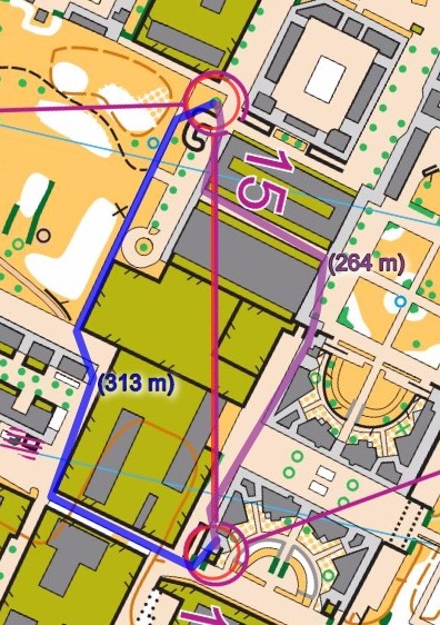 Le scelte di destra sono risultate più veloci di 4-5", in particolare quella di color violetto: il maggior numero di cambi di direzione (che con il maltempo sono diventati delicati per la scivolosità, anche al coperto) sono stati compensati dalla minor lunghezza, dal traffico pedonale sulla scelta rossa e dai gradini della blu. Gli intertempi di questo punto sono in parte influenzati dal fatto di essere o meno passati dal punto K (che sarebbe obbligatorio per regolamento ma che era in un punto poco adatto rispetto al gazebo di partenza e non adeguatamente fettucciato): quasi tutti tagliavano direttamente in diagonale dopo il via.